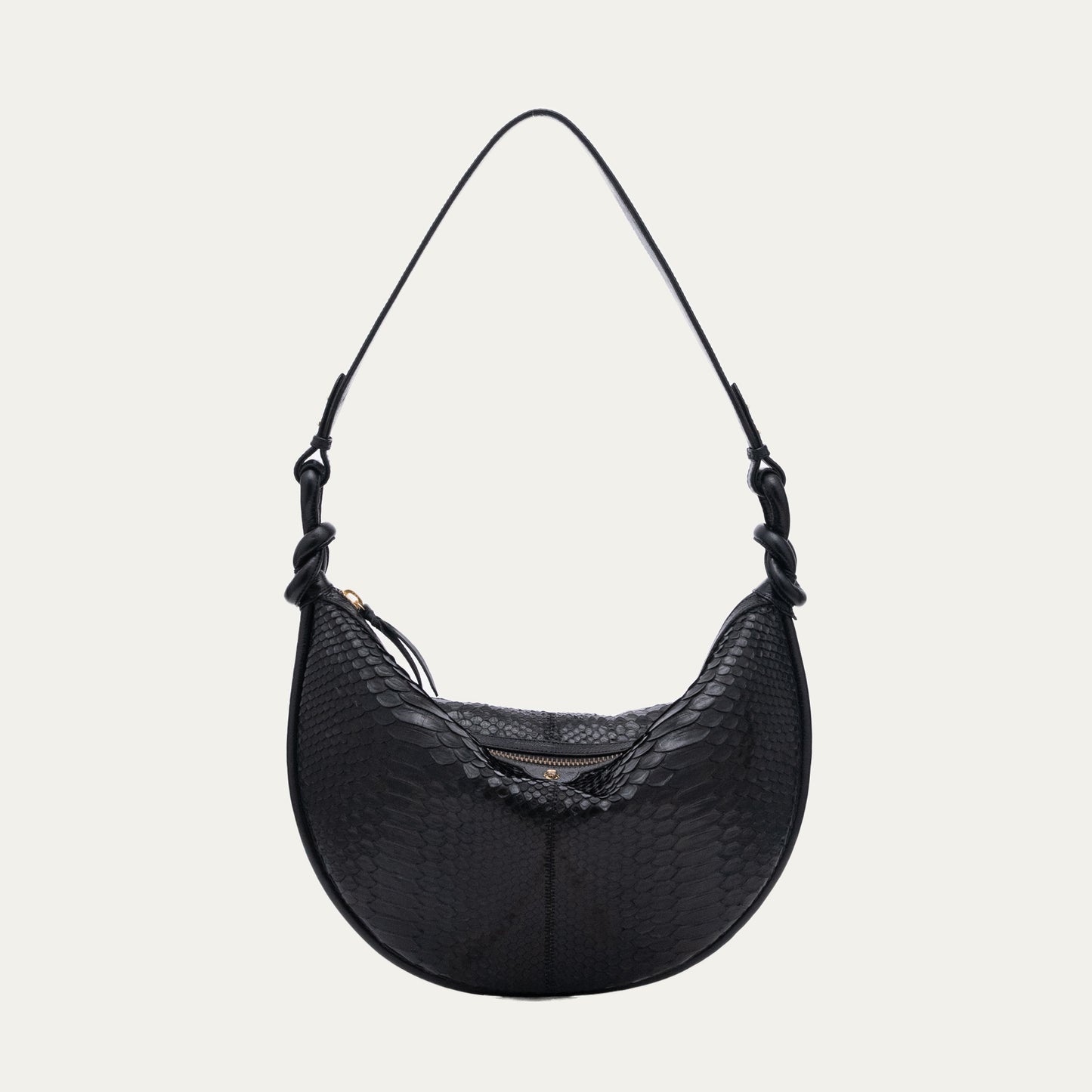 The Chris half-moon bag is made of python. It's handle, interlaced by large leather knots, allows it to be worn on the shoulder or very short as a cross body.