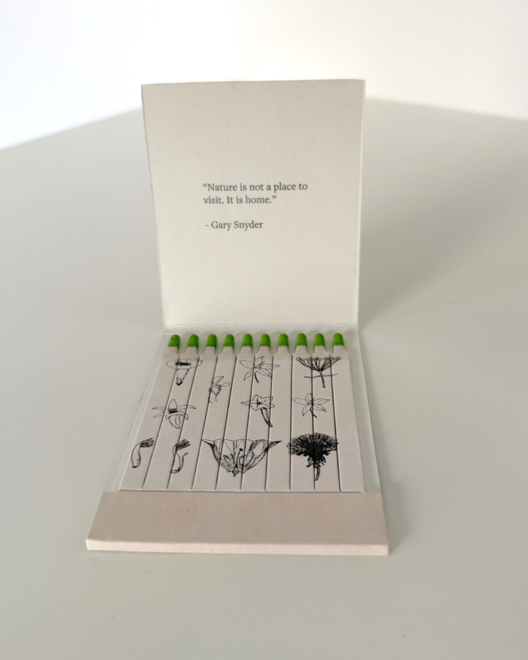 These biodegradable oversized matchbooks showcase a delicate floral illustration, with bright green match heads and printed match stems for a unique botanical touch.