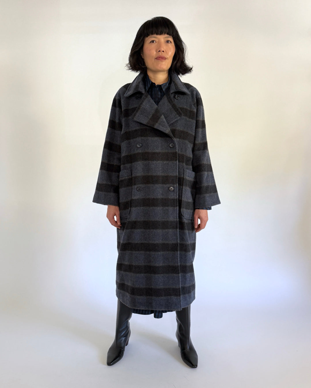 Super cozy and very chic. The navy and black oversized check is an incredibly soft Italian wool blend. The coat features patch pockets big enough for your phone, gloves, a book, even a bottle of wine! Lined in a silky charcoal herringbone. Made in NYC. Dry clean only. To wear forever.
