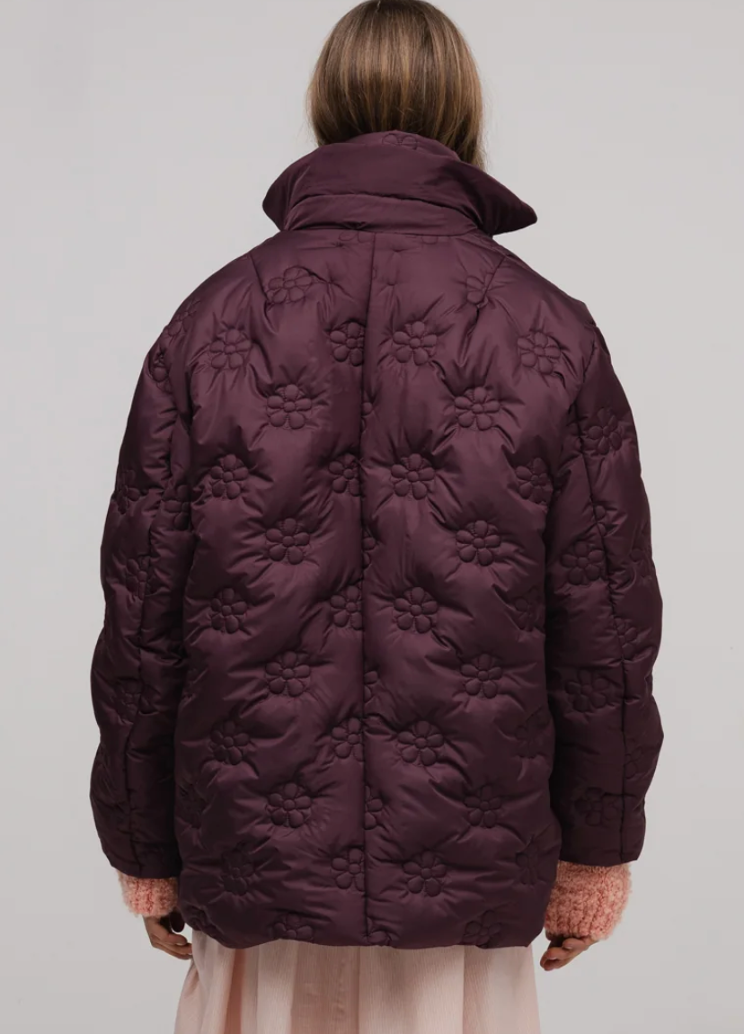 This puff coat is lightly padded and decorated with embroidered flowers all over. It has a boxy, voluminous fit that sits just above the hips, with a classic collar, button front, dropped shoulders, and practical patch pockets at the front.